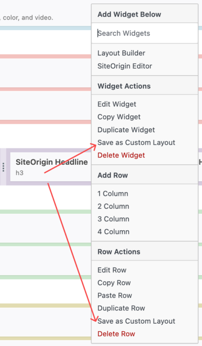Use the Page Builder contextual menu to save rows or widgets as Custom Layouts directly from the editor.