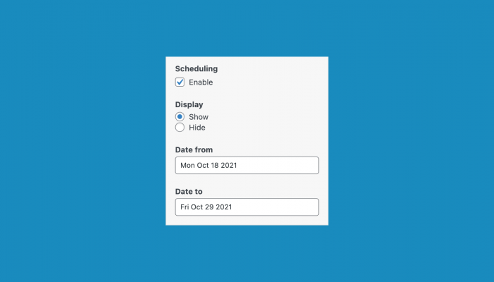 Enable to display the scheduling section. Show or hide the row or widget between a selected date range. Once enabled, the following settings will be available.
