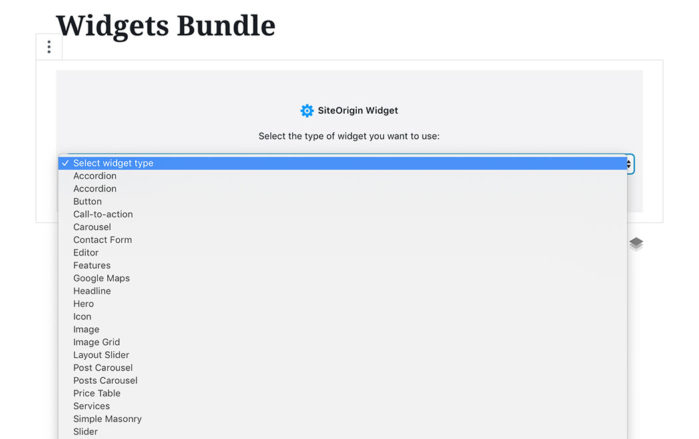 Gutenberg will be the new WordPress editor from version 5.0; it’s currently being tested in plugin form. If you’ve been giving Gutenberg a try, you might have already used the SiteOrigin Layout block which offers a full instance of Page Builder in Gutenberg. We’re really excited to announce that from version 1.13.0, the SiteOrigin Widgets Bundle is now also available as a block. The new Widgets Bundle block allows you to directly add SiteOrigin widgets to your Gutenberg pages.